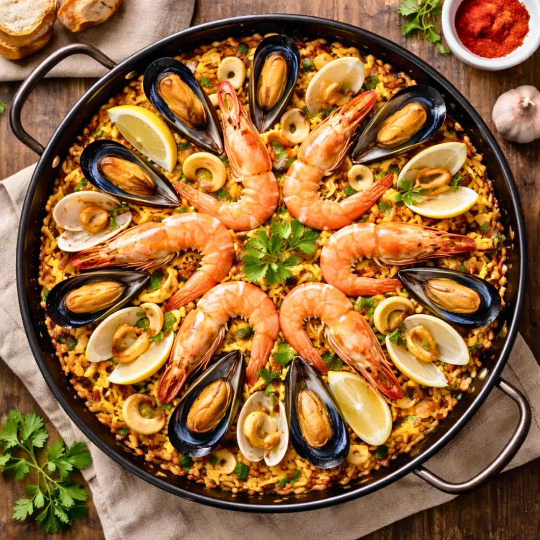Paella mit Meeresfrüchten ist ein klassisches Gericht der mediterranen Küche, das mit hochwertigem Reis, frischen Meeresfrüchten und ausgewählten Zutaten mit großer Sorgfalt zubereitet wird. Garnelen, Muscheln, Tintenfisch und Fisch vereinen sich mit einem aromatischen Sud und feinen Gewürzen zu einem intensiven, ausgewogenen Geschmackserlebnis. Durch das langsame Garen nimmt der Reis alle Aromen auf und erhält eine perfekte, saftige Konsistenz. Ihr verführerischer Duft und ihre reichhaltige Vielfalt machen diese Paella zu einem echten Genuss für besondere Anlässe und gesellige Momente.